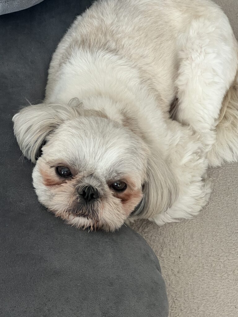 ハッチは、家でくつろいでいるとき、あごを何かに載せて寝ていることが多いです。下の写真は、私が寝転ぶ用のクッションがあるのですが、そのクッションが好きなようで、ふと気づくと、クッションにあごを載せて、寝ています。