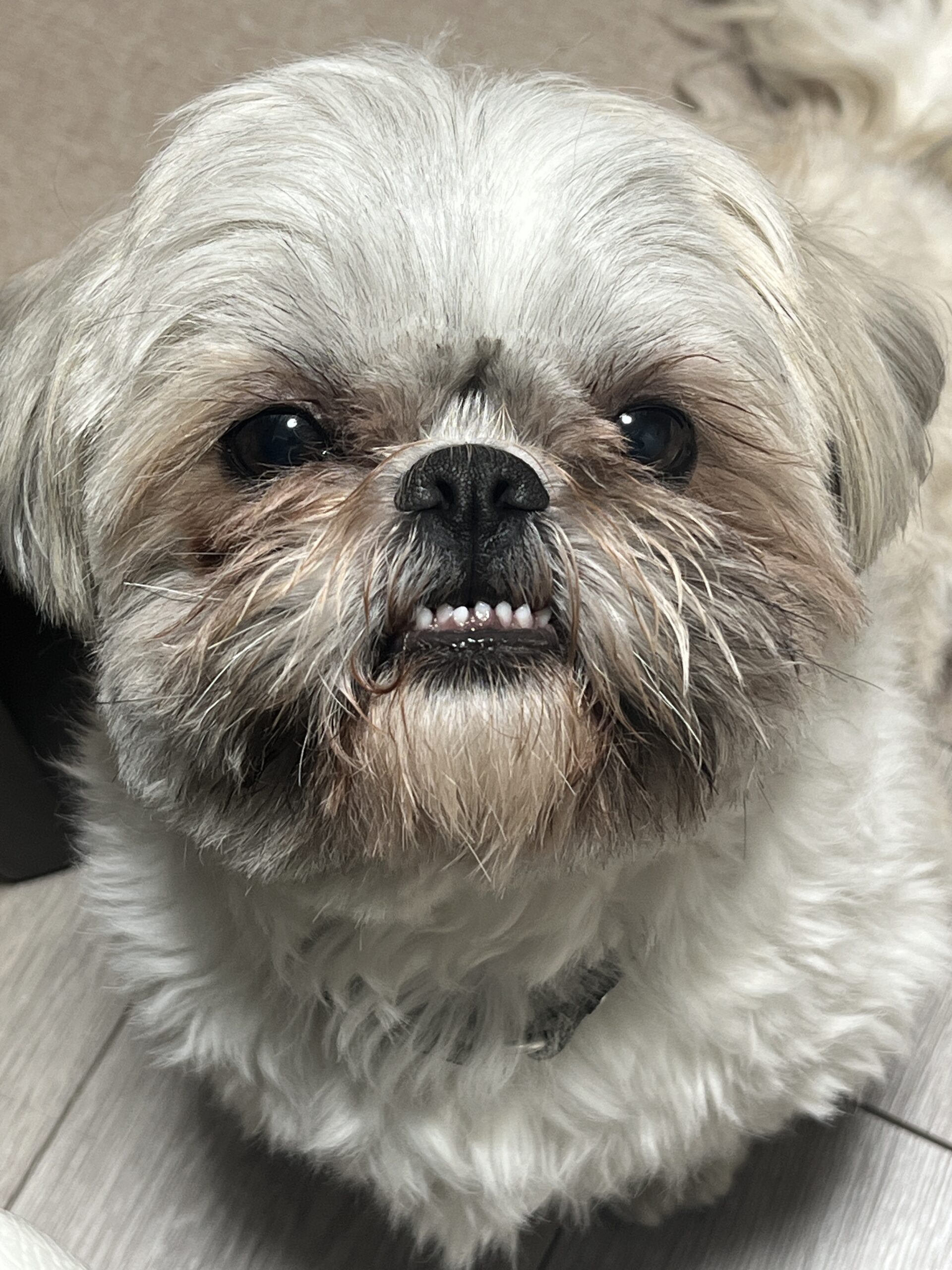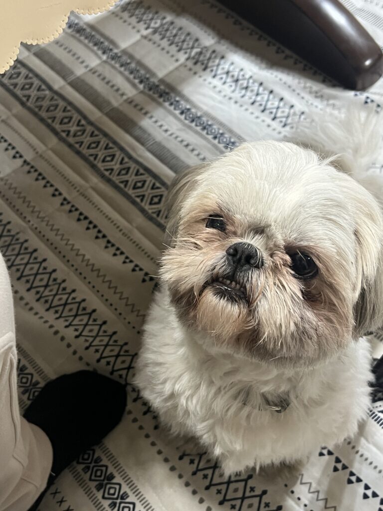 シーズーは受け口の子が多いそうで、ハッチも少しだけ受け口のようです。普段は気になりませんが、食べたいものがあるときは必ず下の歯が出てしまいます。