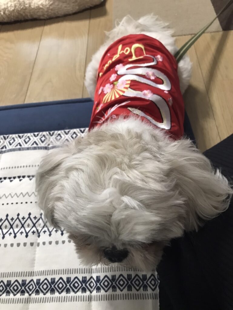 妹一家の犬には小さかったそうで、おさがりでもらったスカジャンタイプ。私なら買わないタイプの洋服なのでハッチには新鮮です。へび年に買ったそうで、へびの絵柄とJapanという文字が描かれています。