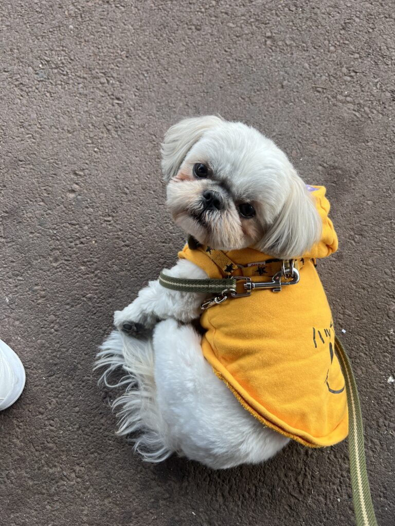 背中に「ハッチ」という名前入りのパーカータイプです。黄色が毛色に映えます。